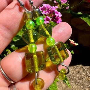 Beautiful Spring Green Art Glass beads in a variety of shapes make up these chunky Statement earrings. Square, cube, bi-cone, round and doughnuts at the bottom. Dangles with an approximate 2.5” drop - please see all pics for best idea of size.