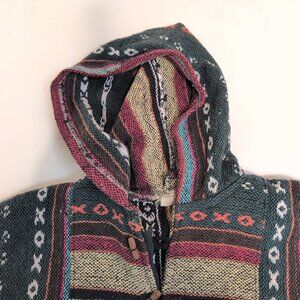 Vintage Unbranded green Baja-style woven hoodie pullover. Women's size XL (Standard). Features a multi-color striped/tribal pattern in green/teal, burgundy, tan, black and white, hood, short buttoned placket, and front kangaroo pocket. Lightweight textured woven fabric (fiber content unknown). Pre-owned — overall good vintage/boho condition with light wear and some loose threads; small frayed area at the bottom hem as shown in photos. No strong odors or major stains visible in images. Please review photos for pattern detail and condition before purchasing.