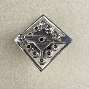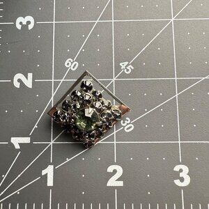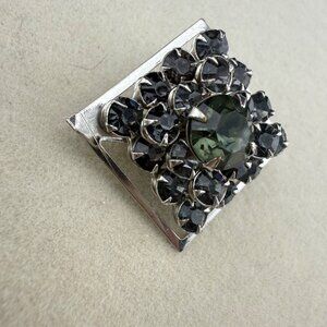 An intricate vintage brooch featuring a central green rhinestone surrounded by black rhinestones in a stunning square design. Crafted with a silver-tone metal backing for classic durability.