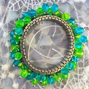 Fun vintage bangle. A mix of larger and smaller faceted blue & green acrylic beads. Silver-tone stretch base similar to a watch band. Excellent stretch and very comfy on my 6.75” wrist with leeway up and down due to the stretch.