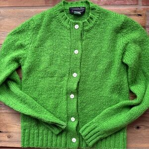 1960’s cozy and stylish with this vibrant green button-up sweater. Perfect for layering and adding a pop of color to your wardrobe. By University Shop New Haven. Size M. Fits More like a size small.