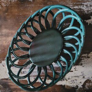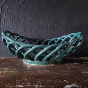 Vintage Green Ceramic Lattice Weave Oval Bread Basket, Cottagecore Basket