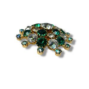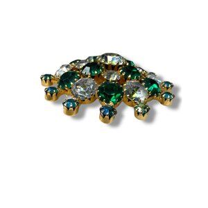 Vintage Green & Clear Rhinestone Brooch Gold Tone 2" Prong Set Roll Over Clasp