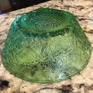 A wonderful green depression glass bowl by Indiana Glass. The pattern is called Pineapple & Floral and consists of a pineapple design center with flowers on the sides.
