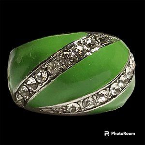 Vintage Green Enamel Cocktail Ring Silver Plated Crystal Rhinestone Size 7 Boho