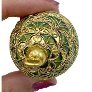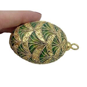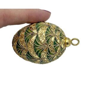 Vintage Green Enamel Egg Ornament Gold Tone Christmas Holiday Tree Decor In Very good pre-owned condition. No chips or cracks. Add a touch of elegance to your holiday décor with this vintage enamel egg ornament in green and goldtone. Beautifully crafted with a glossy enamel finish and metallic accents, this collectible ornament evokes the charm of Fabergé-style designs. Perfect for hanging on a Christmas tree, displaying in a curio cabinet, or gifting to a collector of fine ornaments.