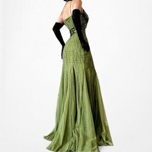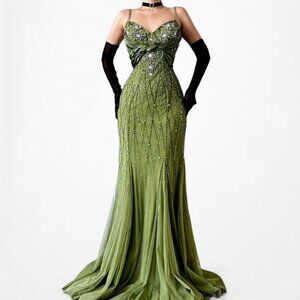 Y2K 2000s coquette fairy green bodycon maxi dress. Sweetheart neckline. Spaghetti straps. Rhinestone beaded throughout over a flared mesh fabric. Back zip closure. Padded