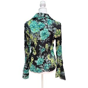 This unique vintage blouse features a green floral print and pleated texture throughout. With its lace detailing and unique collar, this blouse is an absolute showstopper. The sleeves are slightly belled at the hem, adding to the allure of this piece. There is a seamless button closure in the front. Made by S. L. B.