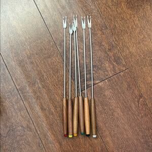 Vibrant and fabulous green fondue set with wooden handle and six forks. Perfect for gatherings.