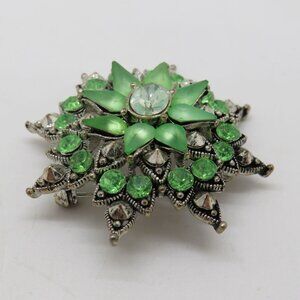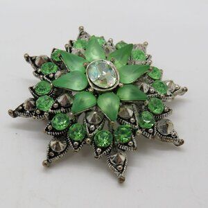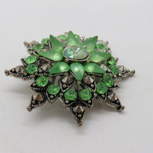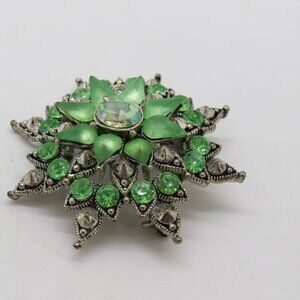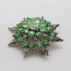 Vintage Green Frosted Rhinestone Starburst 1.5" Brooch Clear Center Silver Tone - Preowned