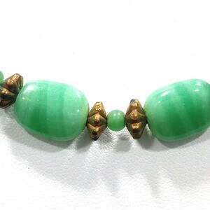 *Description: This necklace is made from vintage green glass beads that have small air bubbles in them from the 1930s or before. Unchecked from a gem tester, you would believe these to be jade but they are indeed glass. Looking closely with a loop, you can see the air bubbles within many of the glass beads. The necklace is 15 inches in length. This would be a great addition to your vintage jewelry or bead collection!
