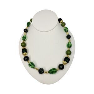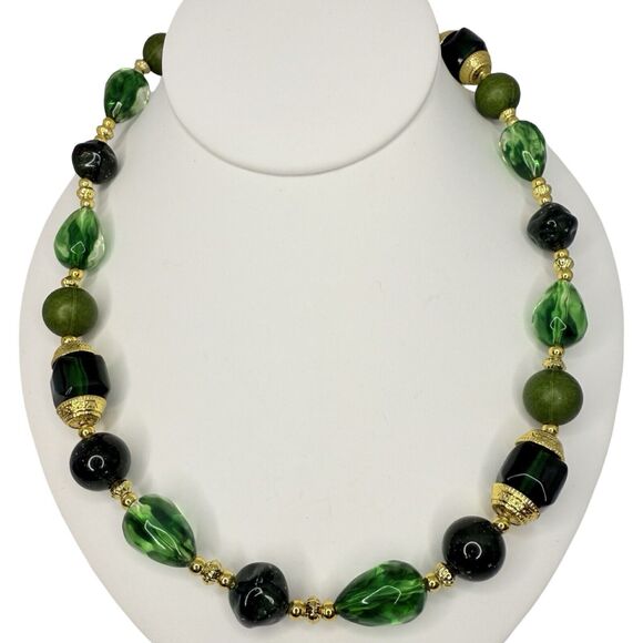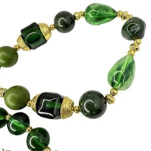Vintage Green Glass Beaded Necklace 30" Gold Tone Lucite Classic