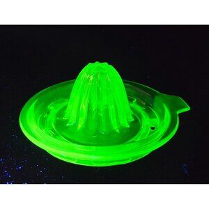 This glass juicer combines functionality and vintage charm, featuring a durable design and glowing green hue under UV light, ideal for collectors or daily use. 3" x 5"