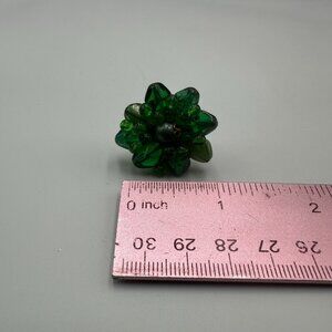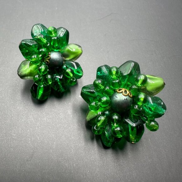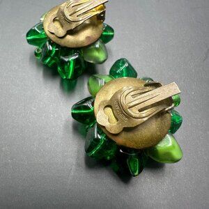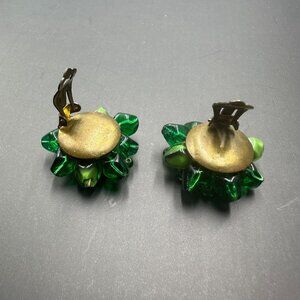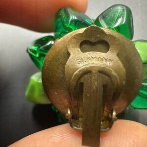 Vintage Green Glass Clip On Earrings Brass Tone Beaded Cluster Signed Germany