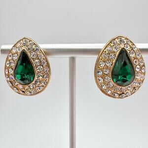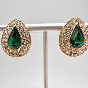 Vintage Green Glass Teardrop Rhinestone Halo Earrings Quality Designer Style