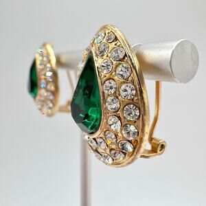 These gold tone, high quality omega back earrings feature green glass pear teardrop stones surrounded by two rows of clear rhinestones. They are unsigned.