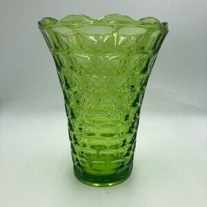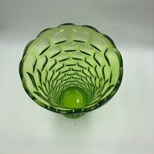 Vintage Green Glass Textured Scalloped Edge Flower Floral Tabletop Vase. Vase in vintage pre-owned. No noticeable cracks/chips. No original box. Please see all photos for visible condition. Thick heavy glass. May contain residue inside. Approximately 8 inches tall x 6.25 inches wide x 3.5 inch base. Brand unknown.