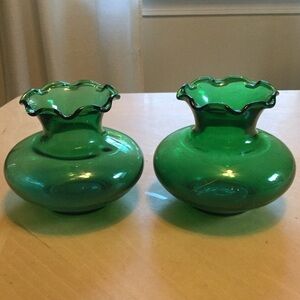 Vintage Green Glass Vases Ruffled Top Set of 2