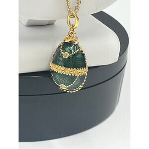 Vintage Green Guilloché Enamel Crystal Egg Gold Plated Pendant Necklace