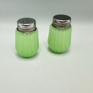 Spice up your kitchen with these charming Vintage pair of green jadeite glass salt and pepper shakers.
