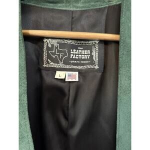 This Vintage Green Leather Jacket/Cardigan by The Leather Factory Phase Texas is a stylish and unique piece perfect for men or women in size large.
