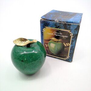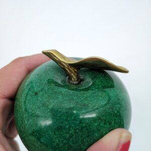 marble paperweight, apple decor, vintage desk accessory, brass apple, teacher gift, green marble apple, paperweight collectible, made in Taiwan, heavy desk decor, stone apple sculpture, retro office decor, bookshelf styling, brass leaf apple, vintage apple paperweight