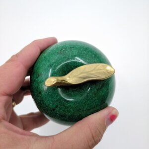 Vintage Green Marble Apple Paperweight Brass Leaf Desk Decor Taiwan