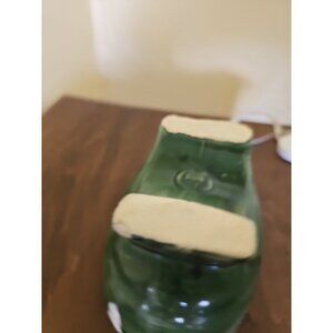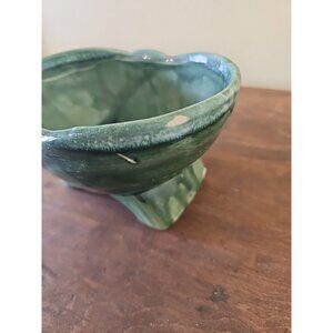 This Vintage Green McCoy Pottery Planter Bowl is a charming addition to any collection. With its asymmetrical shape, brushed finish, and raised relief, it exudes a unique Art Deco style. Made in the United States during the 1950s, this medium-sized ceramic bowl features intricate brush patterns, adding a touch of abstract art to any space. Perfect for all occasions, this unboxed planter bowl is a one-of-a-kind piece that will surely stand out in any room. It has a chip on the leg as seen in photos.