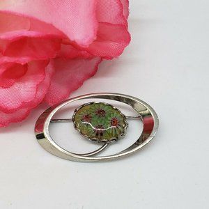 Vintage Green Murano Millefiori Venetian Glass Italian Pin Brooch Silver Tone