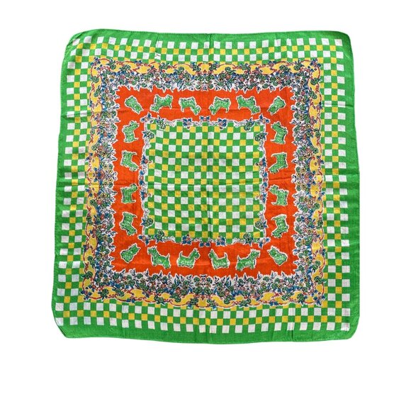This vintage scarf features a playful Scottie dog print with vibrant green and orange tones. The intricate floral border adds a classic vintage charm.