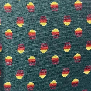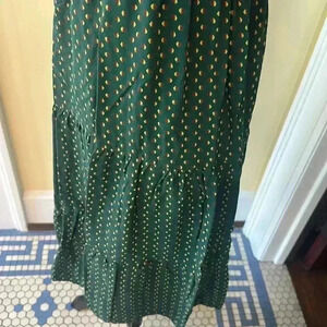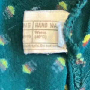 Nice pre-owned vintage condition, no flaws to note. No tags for brand or materials except for the one pictured. Puff at shoulder of sleeve. V-neck with high waistline, pleating at bust. Tiered midi skirt. Zips up the back. Not lined. No size tag, but fits my dress form perfectly, so I’m listing as a small. However, please see measurements for a more accurate size. Pattern reminds me of Farm Rio.