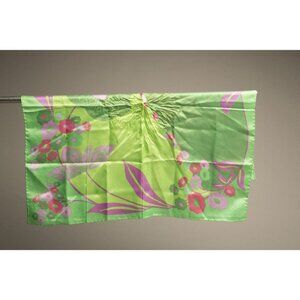 A delicate silk scarf capturing the vibrant botanical aesthetics of mid-20th century design. Soft green backdrop adorned with stylized pink and purple flowers and leaves, showcasing the artful print techniques of its era.