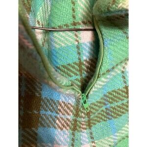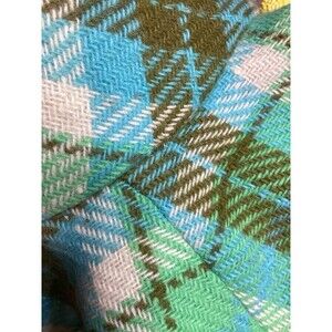 This Vintage green, white & blue Plaid Fringe Polyester Cape Poncho Shawl looks to be handmade.The 70s-inspired piece has a bohemian, hippie vibe. Probably made from a blend of polyester and wool, this sleeveless cape features an open-knit design with a collared neckline and crochet accents. The color green, fringe detailing, and 1/4 zip closure add to the retro, colorful aesthetic of this unique piece, perfect for travel or casual occasions during the winter, fall, or spring seasons.