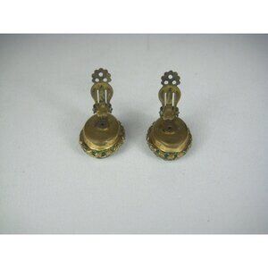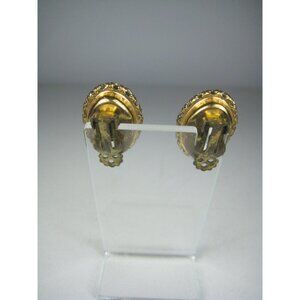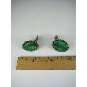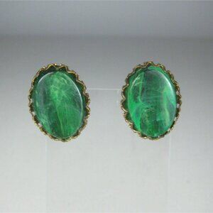 Vintage Green Plastic Clip On Earrings Gold Tone Oval Jewelry Faux Stone 1 inch