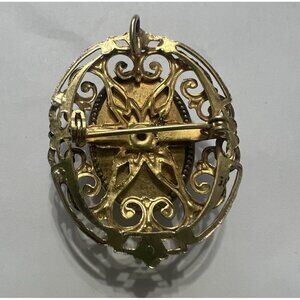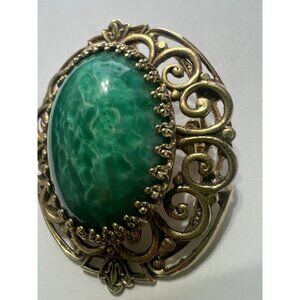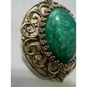 Vintage Green Slag Glass Brooch Victorian Style Ornate Gold Filigree Pin Combo