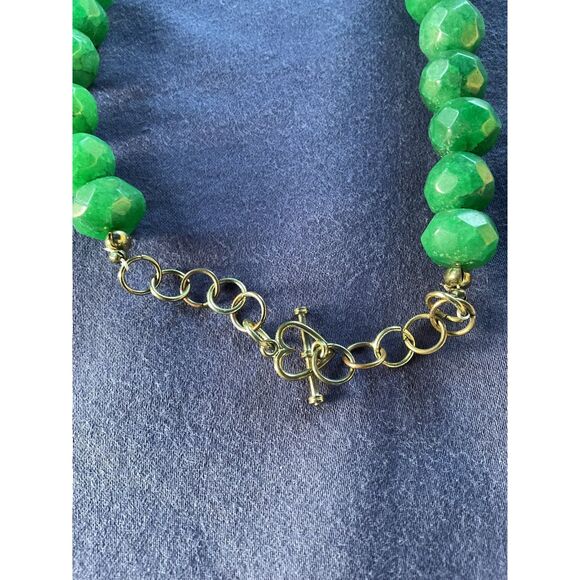 Faceted green stone, either Jadeite or Green Emerald, per Google. Weighs 6oz and measures approximately 11 in. Adjustable heart shaped toggle clasp