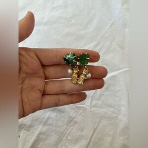 Green stones set in gold tone metal with faux pearl and metal tassels; tassel and pearl dangle. Clip on with screw backs.