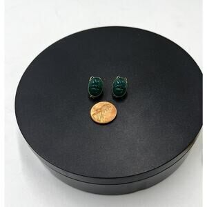 This is a vintage pair of green glass oval scarab clip-on earrings measuring