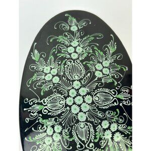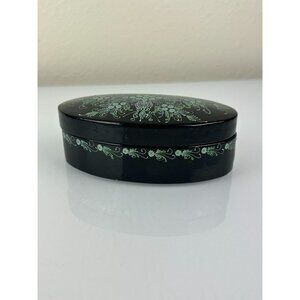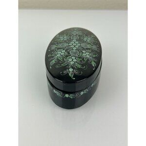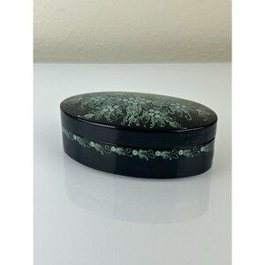 Vintage Green Teal Black Lacquer Oval Trinket Box Floral Pretty Home Decor Vanit