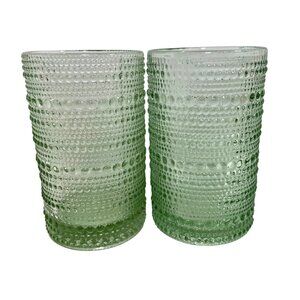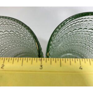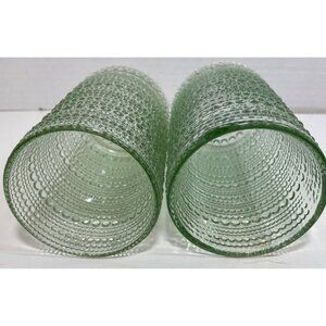 These vintage green glass tumblers offer a charming bubble pattern design, adding a retro aesthetic to drinkware collections. Ideal for serving beverages elegantly.