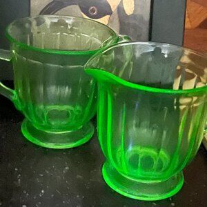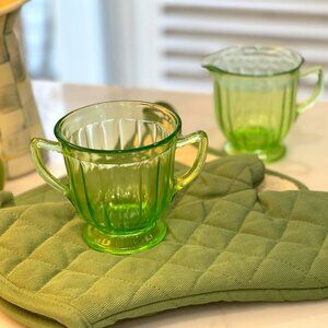 Vintage Green Uranium Glass Sugar & Creamer + Pot Holders (4 +pc. Bundle) + quality free gift!?