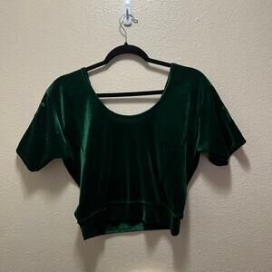 Crop Top Green Velvet Blouse Embroidered Floral Scoop Neck Short Sleeves Sz M