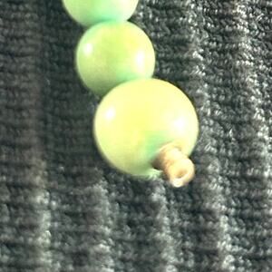 This vintage green wood bead necklace features a stunning graduated design of flat disc-shaped beads that transition to smaller round beads near the clasp. The smooth, natural wood beads are dyed in a soft green hue, giving the piece a boho, earthy vibe. It measures approximately 20 inches in total length and fastens with a screw clasp, as shown in the photos.