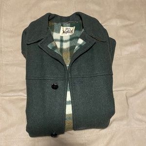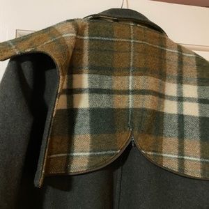 This is a vintage Woolrich green coat. It is a lovely heavy, warm men's size 44. Measures 36 " long from the shoulder. Excellent condition for its age. Very cool brown and green plaid inside lining. The hood is removable. Quality craftsmanship made in the USA. The only sign of age is the leather bottoms have some very minor cracking. I believe this coat is from the 60s or 70s.