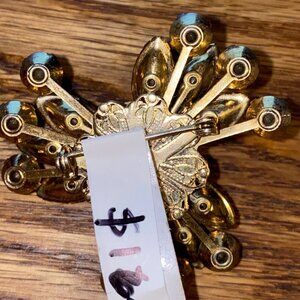 This Vintage Green & Yellow Rhinestone Tri-Petaled Brooch is about 2" in size. It's a unique piece of vintage jewelry, adorned with sparkling rhinestones in green and yellow hues.