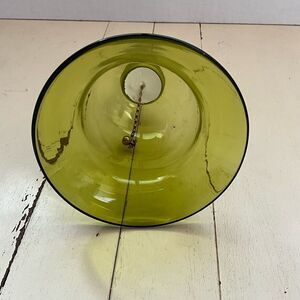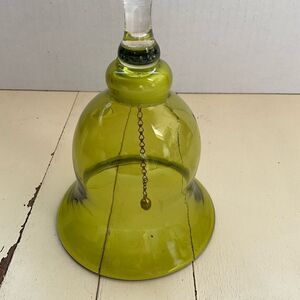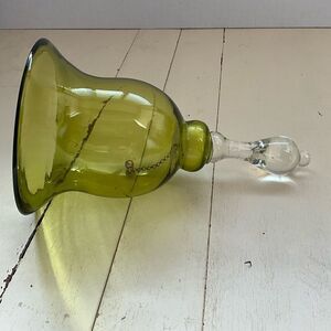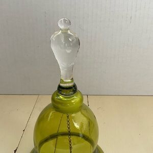 Vintage Green and Clear Pilgrim Glass Handblown Brass Clapper. A perfect addition to any bell collection. The bell color is kind of a yellowish green and the handle is clear glass. Excellent condition. No chips, cracks or repairs.