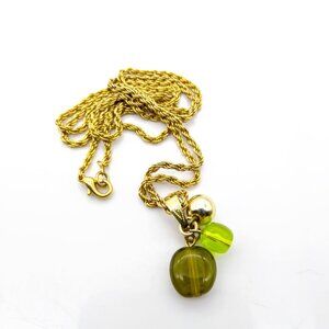 Vintage Green and Gold Charms Necklace, Long Gold Tone Rope Chain with Plastic and Ball Pendants