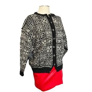 Vintage knit sweater. No identifying tags, feels really well made and high quality. Silver buttons down the front and a winter pattern.