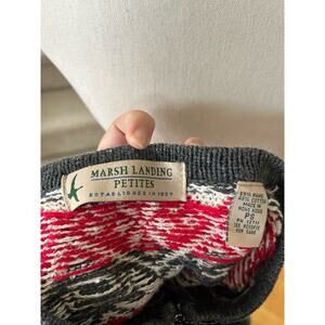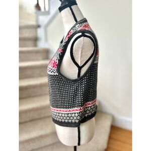 Very good condition, there is some inner pulling that does not affect the outer appearance. Grey, red and white with a Scandinavian/Icelandic snowflake design. Decorative silver metal clasps line the front. Sleeveless, knit.