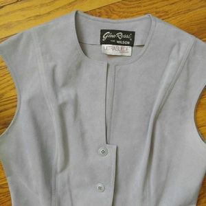 Sleek, well-tailored vintage grey suede button-front dress with almost keyhole-like neckline by Gino Rossi for Wilson. Size: 10. This cut is so incredibly flattering, and the neckline shows *just* enough while still being professional. Missing the very last button on front.